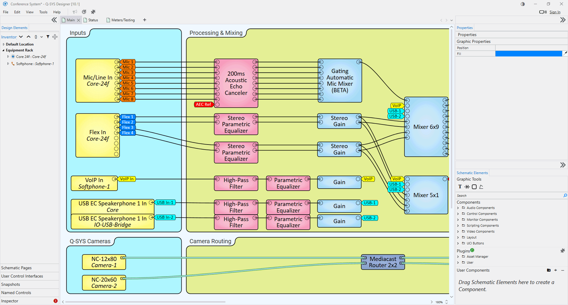 Q-SYS Designer Software is the most powerful yet simple advanced DSP design software on the market today. This software enables the user to create designs for native Q-SYS Platform system and also supports the integration of the greater Q-SYS Ecosystem. The system design environment was created specifically to be intuitive and easy to use. It is laid out without clutter or complicated multi-level menus. As a result, the software allows system integrators to focus their energy on building the audio system, rather than laboring over a complex software learning curve.
